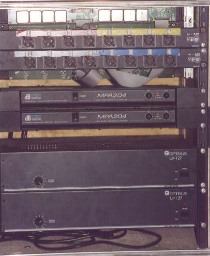 Alla base della Rampa Diametrale, dove era il meccanismo di sollevamento del ponte levatoio (foto) : 1 Rack con 2 finali SOUND SYSTEMS model 400 ed un crossover elettronico ACOUSTIC SYSTEMS XA-P3 (foto) , per i diffusori della parte esterna. Dei due finali solo uno è effettivamente utilizzato, l'altro rappresenta una scorta che è sempre meglio prevedere. La linea di potenza passa nello spazio al di sotto del grande portone, viene sdoppiata sul ponte levatoio e raggiunge i due diffusori UPA 1-c che quindi lavorano in parallelo.